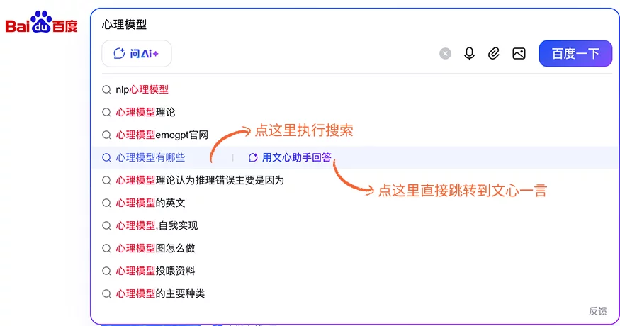 通常,搜索下拉框的每一行(List Item)都是一个完整的点击热区,用户习惯于看到词就点,不分左右。但这里,百度将同一行切分成了两个逻辑: 左侧点击:执行常规搜索,跳转 SERP(搜索结果页)。 右侧点击:拦截搜索请求,直接跳转到文心一言。 在搜索这个亿级流量入口,强行植入文心一言,能瞬间拉升 AI 产品的日活(DAU)和使用率,漂亮的 KPI 是跑不了了。但这种「明明想搜网页,你非要给我看 AI」的强买强卖感,可能引发用户的反感,类似的设计问题很容易被放大传播,形成负面舆论。