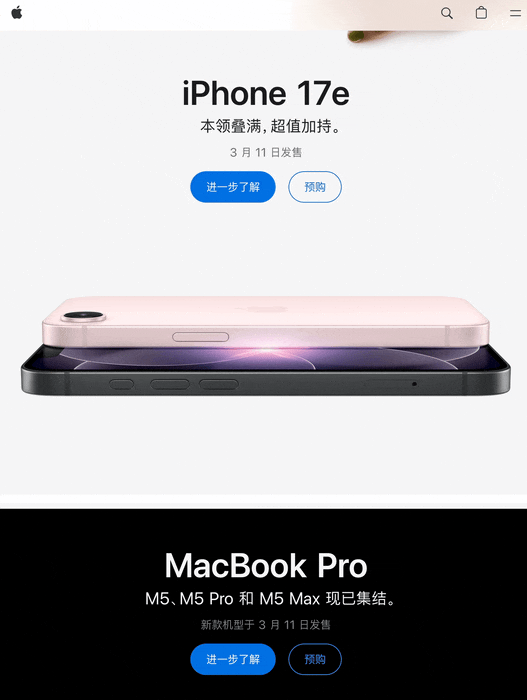 苹果官网在展示 MacBook Neo 时,并没有采用常规的生硬跳转,而是安排了一只「手」作为视觉引导。它先把前序产品的残影「推开」,紧接着从底部稳稳托起并翻开新电脑,完成了一次充满戏剧性和镜头控制感的开场。配合着屏幕中央醒目且亲切的「你好,Neo。」文案,整个出场没有罗列哪怕一个参数。它传达的情绪价值极其纯粹——这款设备轻盈、灵动,且与你无比亲近。