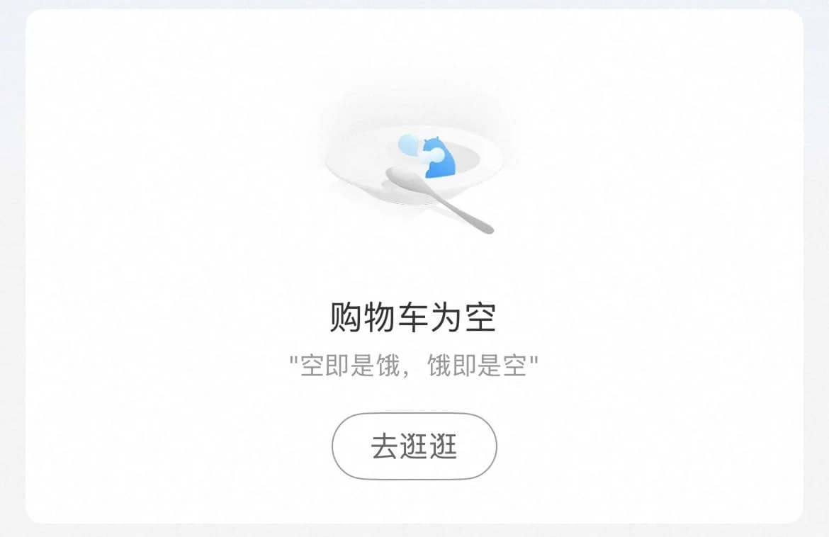盒马 App 购物车页面的「空状态」引导。主标题客观描述状态「购物车为空」,副标题则巧妙化用了《般若波罗蜜多心经》中的「色即是空,空即是色」,改写为「空即是饿,饿即是空」。这种「佛系」调侃瞬间中和了用户面对空白页的失落感。