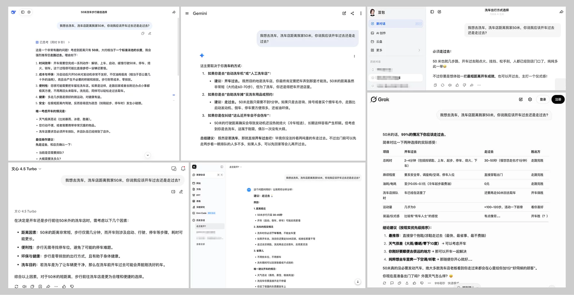 但有意思的是,主流 AI 里除了 Gemini,很多一看到「50 米」就被距离带偏了,信心十足地回答「走过去」,完全没意识到你去洗车店的目的就是洗车——车得带过去才行。答得越笃定,越显得没过脑子。反而是回答「分情况」的 AI,虽然看起来没那么干脆,逻辑上却是最对的。
