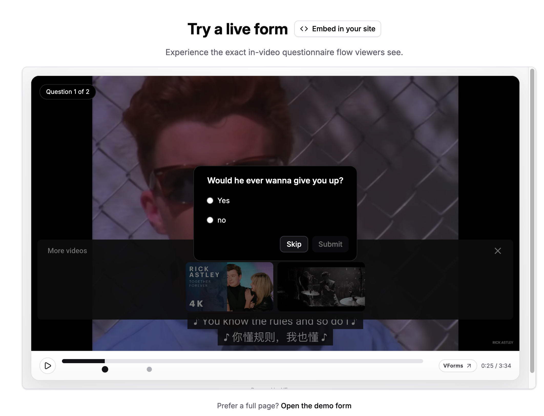 具体来说,用户只需粘贴 YouTube 链接,就能在视频的特定时间点添加各种类型的问题。这种上下文相关的反馈,能够让内容创作者更加精准地收集观众的意见,确保信息的有效性和质量。还有个特别的功能就是 “跳过逻辑”,根据观众的回答直接跳转到视频的特定部分,这样互动性更强。