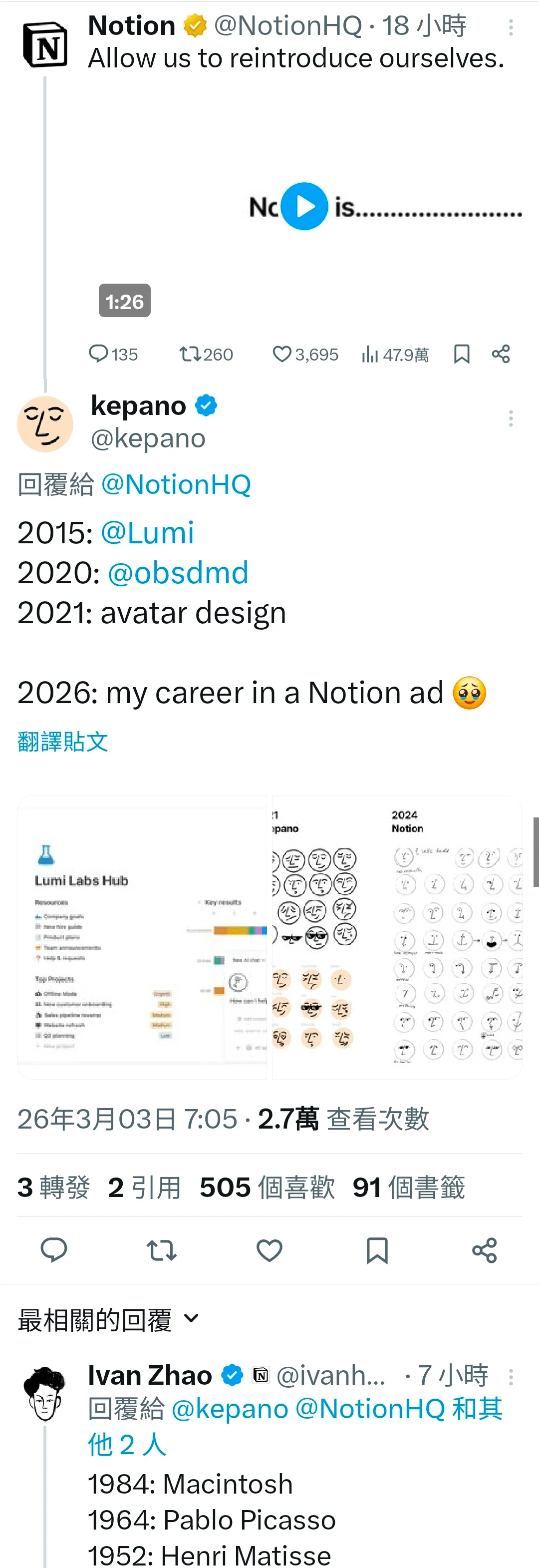 Notion 官方账号发了一条很长的 rebranding / 新形象宣传视频,用了大量盐系线稿风(柔和色调、细线条、梦幻日常小场景)的插画和动画。